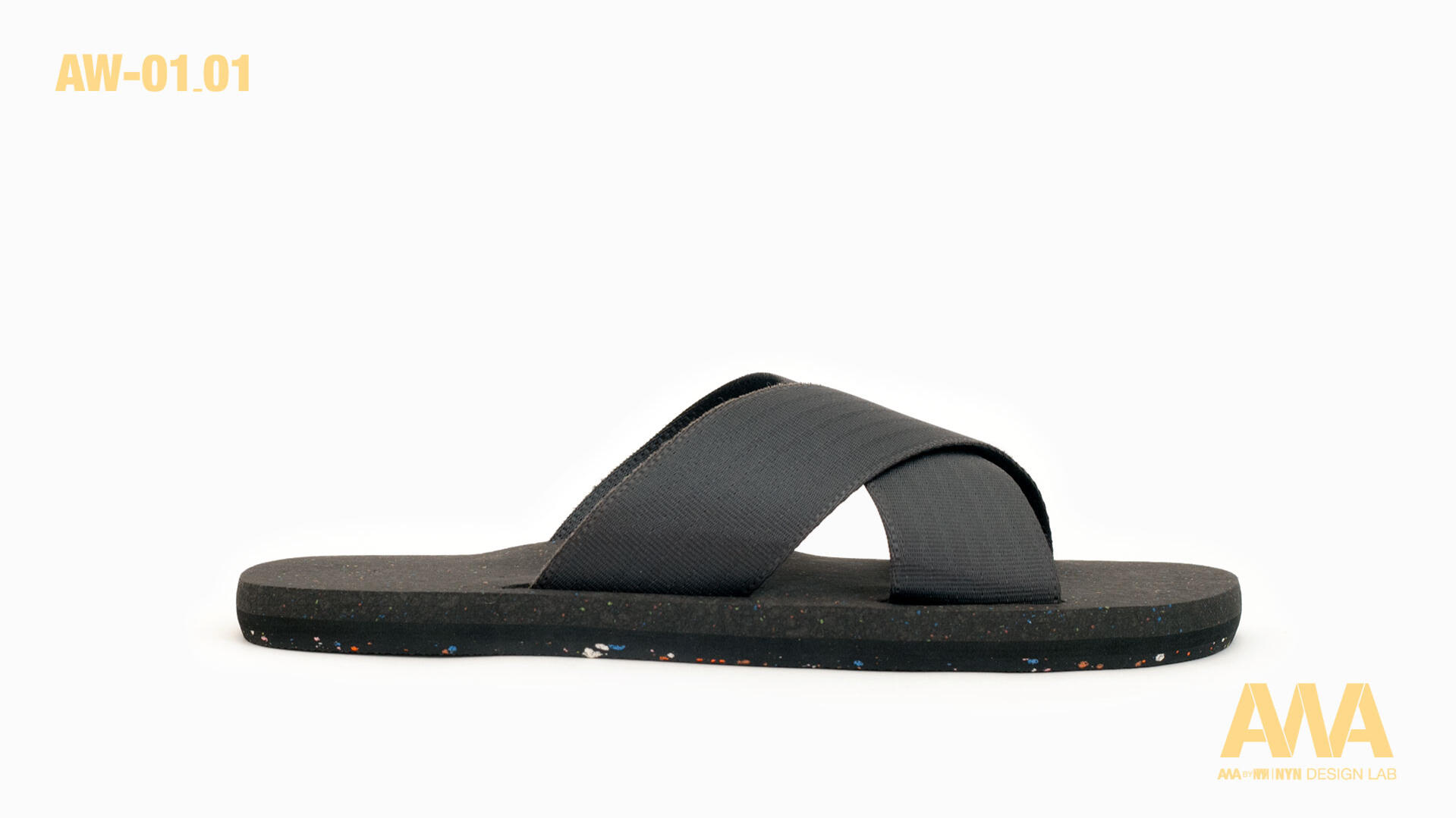 Sandal AW01-01 for Spring-Summer 2024, made with upcycled and recycled materials. Straps made from seatbelts, recycled rubber sole. Comfortable, chic, handcrafted in Taiwan.