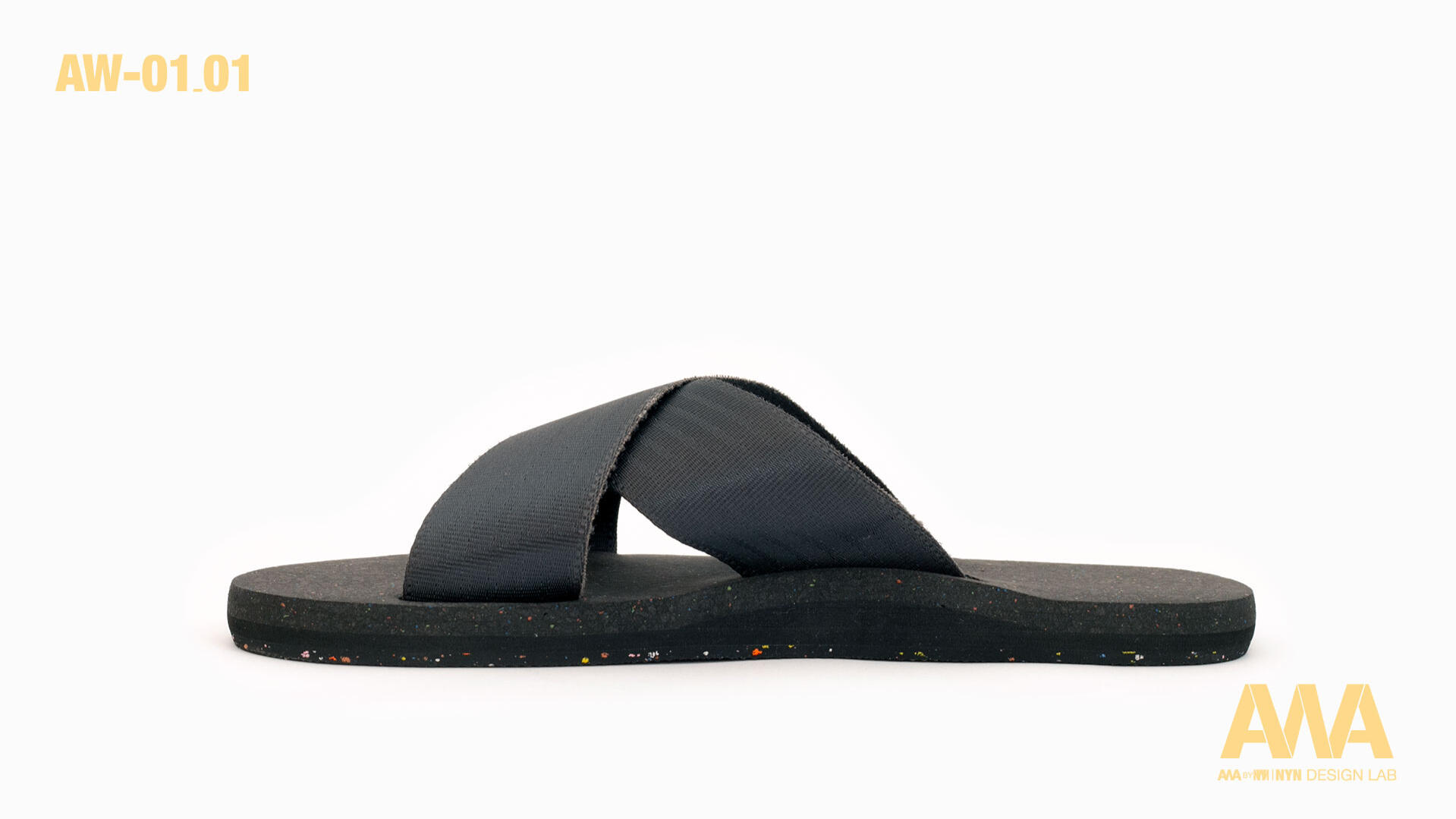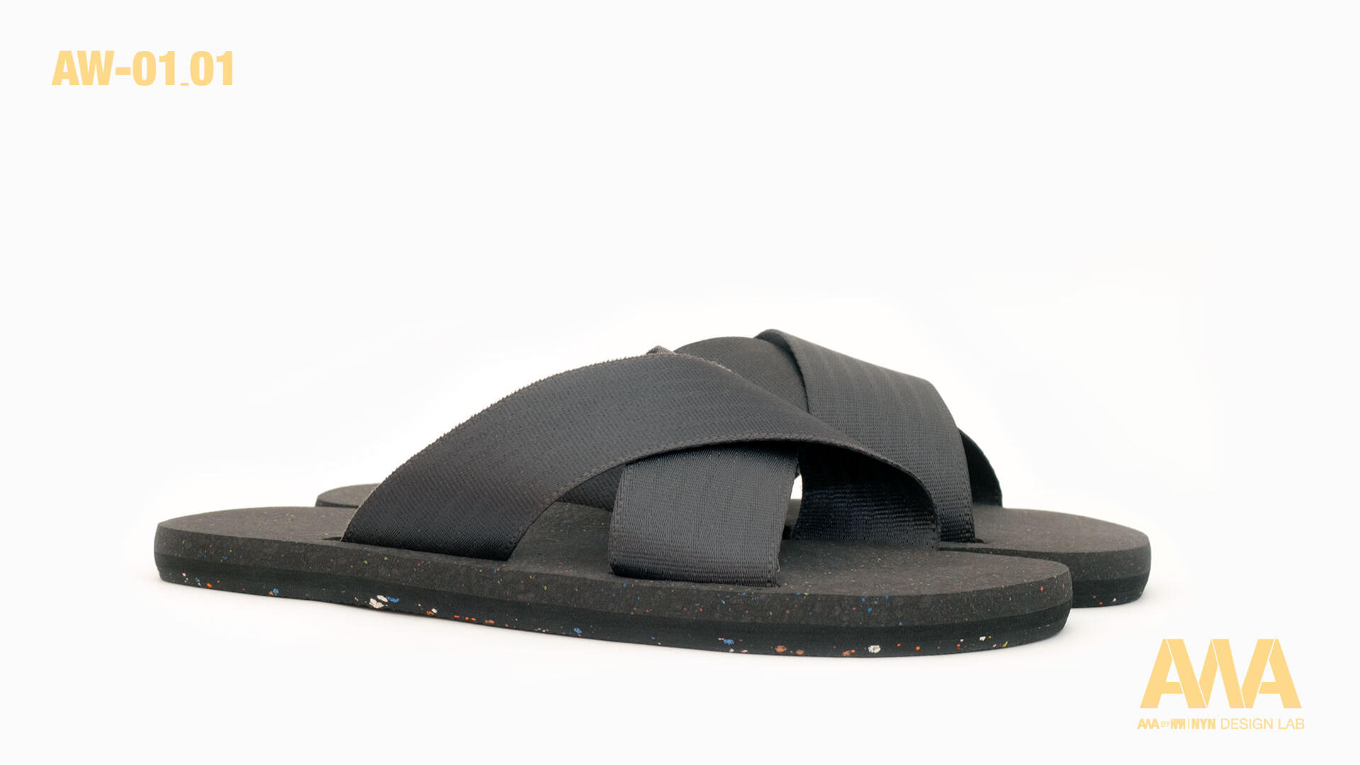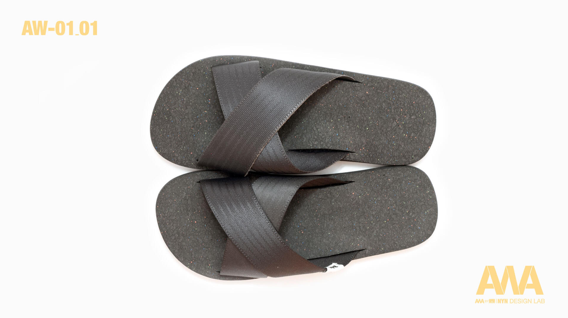 Sandal AW01-01 for Spring-Summer 2024, made with upcycled and recycled materials. Straps made from seatbelts, recycled rubber sole. Comfortable, chic, handcrafted in Taiwan.