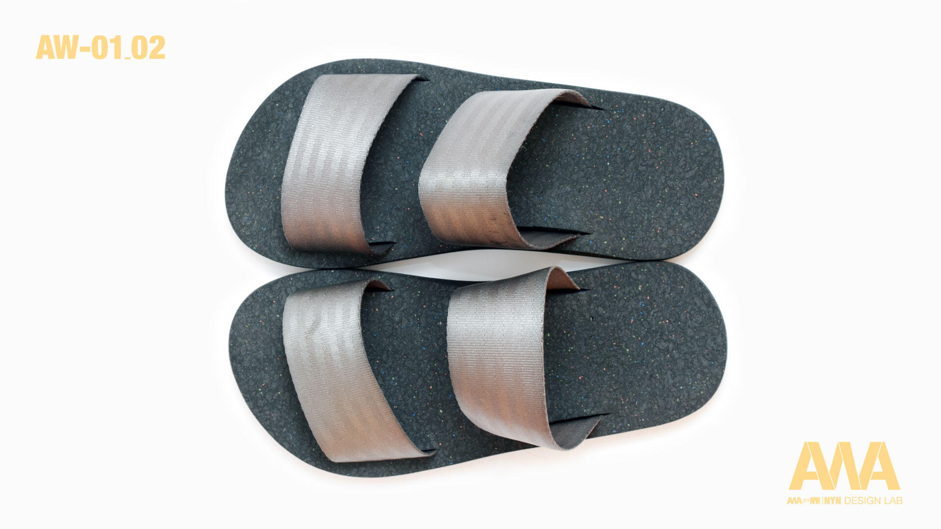 Sandal AW01-02 for Spring-Summer 2024, made with upcycled and recycled materials. Straps made from seatbelts, recycled rubber sole. Comfortable, chic, handcrafted in Taiwan.
